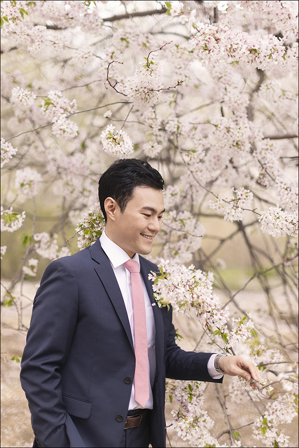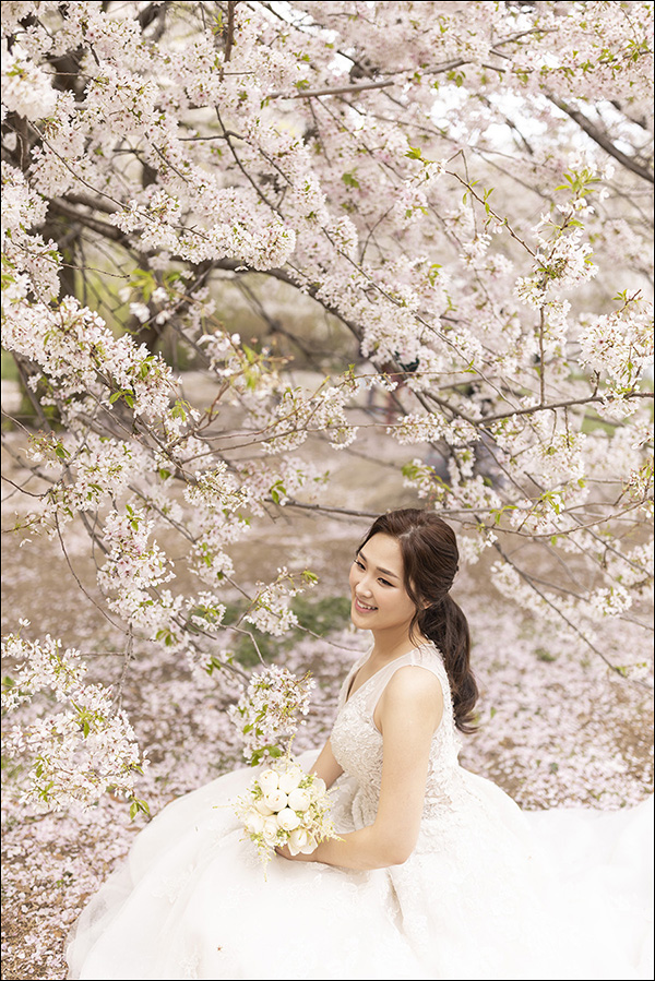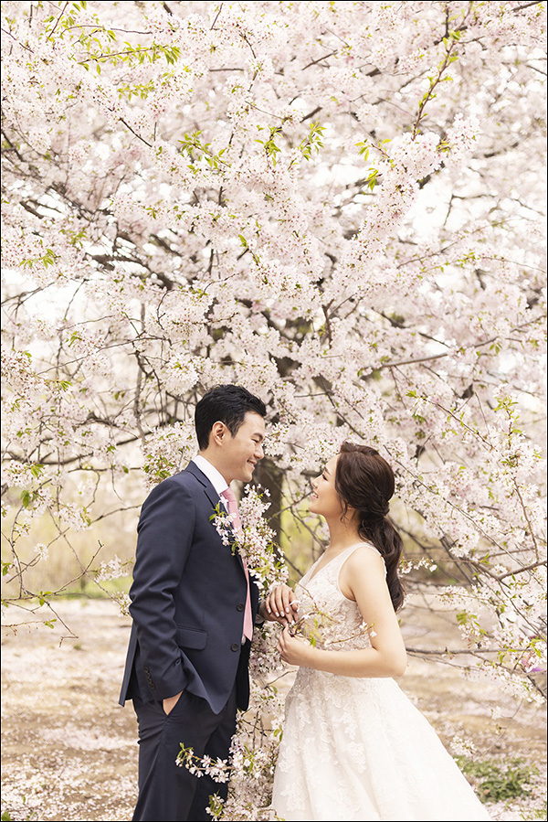 Cherry blossoms come in various colors, but these ones have a beautiful pink hue. I’ll soon upload some gorgeous landscape photos I took alone. The pink cherry blossoms perfectly complement the atmosphere between the couple and our photo editing tone.