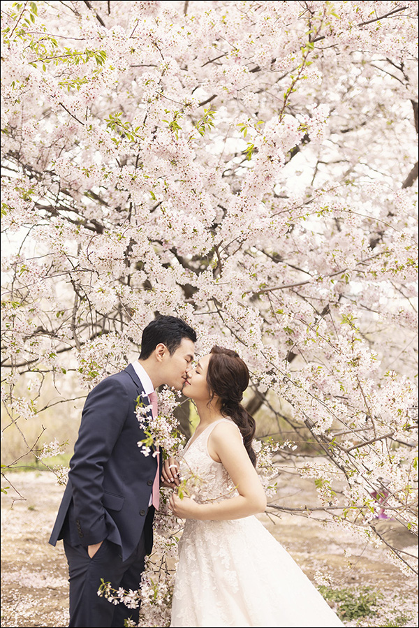 Normally, when cherry blossoms are in full bloom, forsythia tends to wilt a little… but this couple is also surrounded by vibrant forsythia! It may look similar, but this kiss shot emphasizes a more feminine feel.